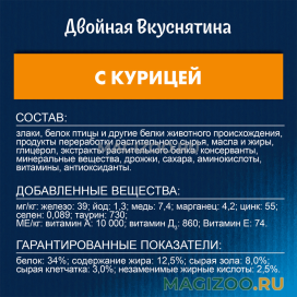Состав товара:злаки, мясо и продукты переработки мяса (мин. 4% птицы на базе восстановленного вещества), продукты переработки растительного сырья, масла и жиры, глицерол, экстракты растительного белка, консерванты, минеральные вещества, дрожжи, сахара, аминокислоты, витамины, красители, антиоксиданты.