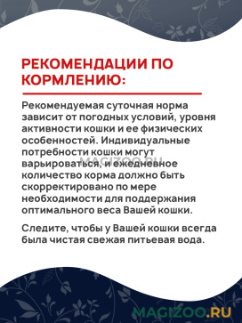 Без добавления искусственных красителей. Рекомендации по кормлению:Рекомендуемая суточная норма зависит от погодных условий, уровня активности кошки и ее физических особенностей. Индивидуальные потребности кошки могут варьироваться, и ежедневное количество корма должно быть скорректировано по мере необходимости для поддержания оптимального веса Вашей кошки.