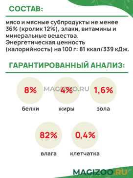 Состав: мясо и мясные субпродукты не менее 36% (кролик 12%), злаки, витамины и минеральные вещества.