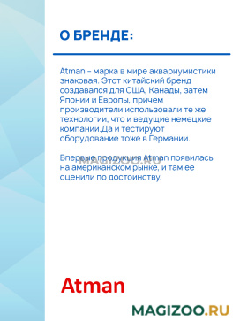 Информация о составе и ингредиентах, цветовом решении, технических и иных характеристиках, стране-изготовителе, внешнем виде и комплекте поставки товара носит справочный характер и основана на последних доступных к моменту публикации сведениях. Доставка данного товара осуществляется во все регионы РФ.Впервые продукция Atman появилась на американском рынке, и там ее оценили по достоинству.