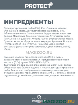 Дегидратированная рыба (23 %), рис, очищенный овес, утиный жир, горох, дегидратированный лосось (5 %), яблочные волокна, льняное семя, гидролизаты животных белков, псиллиум, семена огуречника, аутолизаты рыбы (0,6 %), пивные дрожжи, хлорид калия, водорослевое масло, сульфат кальция, фруктоолигосахариды, артишок, больдо, кустарниковая ива, куркума, розмарин, дрожжевые экстракты (Saccharomyces cerevisiae, Cyberlindnera jadinii), юкка.