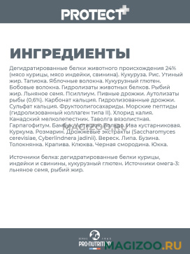 Дегидратированные белки животного происхождения 24 % (мясо курицы, мясо индейки, свинина), кукуруза, рис, утиный жир, тапиока, яблочные волокна, кукурузный глютен, бобовые волокна, гидролизаты животных белков, рыбий жир, льняное семя, псиллиум, пивные дрожжи, аутолизаты рыбы (0,6 %), карбонат кальция, гидролизованные дрожжи, сульфат кальция, фруктоолигосахариды, морские пептиды (гидролизованный коллаген типа II), хлорид калия, канадский мелколепестник, таволга вязолистная, гарпагофитум, бамбук, артишок, больдо, ива кустарниковая, куркума, розмарин, дрожжевые экстракты (Saccharomyces cerevisiae, Cyberlindnera jadinii), вереск, липа, бузина, толокнянка, крапива, клюква, черная смородина, юкка.