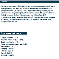 Дегидратированные белки животного происхождения 24 % (мясо домашней птицы (9 %), свинина (15 %)), кукуруза, пшеница, лущеный овес, яблочное волокно, волокна бобов, семена льна, свиной жир, гидролизаты животных протеинов, мякоть свеклы, пивные дрожжи, карбонат кальция, рыбные аутолизаты, рыбий жир, фруктоолигосахариды, морские пептиды (гидролизованный коллаген, тип ii), экстракт дрожжей (saccharomyces cerevisiae, ciberlindera jadini).