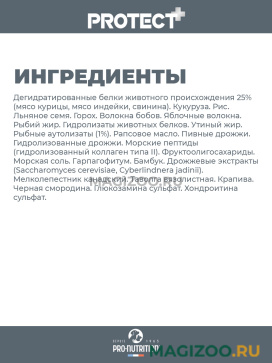 Дегидратированные белки животного происхождения 25 % (мясо курицы, мясо индейки, свинина), кукуруза, рис, льняное семя, горох, волокна бобов, яблочные волокна, рыбий жир, гидролизаты животных белков, утиный жир, рыбные аутолизаты (1 %), рапсовое масло, пивные дрожжи, гидролизованные дрожжи, морские пептиды (гидролизованный коллаген типа II), фруктоолигосахариды, морская соль, гарпагофитум, бамбук, дрожжевые экстракты (Saccharomyces cerevisiae, Cyberlindnera jadinii), мелколепестник канадский, таволга вязолистная, крапива, черная смородина, глюкозамина сульфат, хондроитина сульфат.