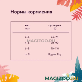 Сбалансированное полнорационное питание заботится о коже и шерсти и способствует здоровому пищеварению.В рационе кормов FLORIDA используется только белок животного происхождения.