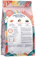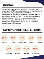 Состав: дегидрированное куриное мясо 28 %, рис, маис, куриный жир (8 %), ферментированный протеин, дегидратированные цельные яйца, натуральная вкусо-ароматическая добавка, витаминно-минеральный комплекс, рыбий жир, жом свёклы, DL-метионин (7000 мг/кг), топинамбур (источник пребиотика), таурин (3000 мг/кг), ромашка, расторопша, экстракт Юкки Шидигера (500 мг/кг), антиоксидант.