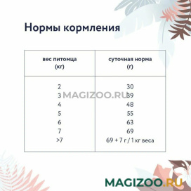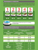 Рекомендации по кормлению: Переход с предыдущего рациона осуществлять постепенно, небольшими порциями в течение 5-7 дней. Рекомендации по кормлению могут варьироваться в зависимости от возраста, состояния, активности и условий содержания животного.
