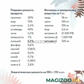 Пищевые добавки (на 1 кг): медь – 18 мг, цинк – 160 мг, железо - 100 мг, йод - 2,6 мг, Витамин А- 21000 МЕ, Витамин Д – 1500 МЕ, Витамин Е – 320 мг, Омега-3 - 0,38 %, Омега-6 - 2,8 %.