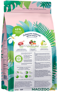 Состав: дегидрированное мясо говядины 32%, рис, маис, гидролизованные мясо и печень ягнёнка 8%, куриный жир , масло лососевых пород, минеральные вещества, пивные дрожжи, сушёная мякоть свёклы, яйца сушеные, семя льна, витамины, сушёная груша, сушеная морковь, сушеная ромашка, инулин (источник ФОС), экстракт Юкки Шидигера, таурин.