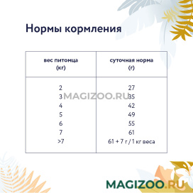 Рекомендации по кормлению: Переход с предыдущего рациона осуществлять постепенно, небольшими порциями в течение 5-7 дней. Рекомендации по кормлению могут варьироваться в зависимости от возраста, состояния, активности и условий содержания животного.