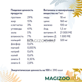 Пищевые добавки (на 1 кг): медь - 18 мг, цинк - 160 мг, железо - 100 мг, йод - 1,5 мг, Витамин А - 21000 МЕ, Витамин Д - 1500 МЕ, Витамин Е - 320 мг, Омега-3 - 0,35 %, Омега-6 - 2,8 %.