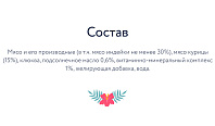 Состав: Мясо и его производные (в т.ч. мясо индейки не менее 30%), мясо курицы (15%), клюква, подсолнечное масло 0,6%, витаминно-минеральный комплекс 1%, желирующая добавка, вода.