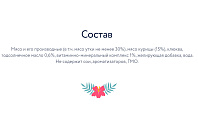 Состав: субпродукты свиные, субпродукты цыплят-бройлеров, вода, телятина, желирующая добавка, плазма крови свиной, пшеничная клетчатка, витаминно-минеральный комплекс, льняное масло, отруби пшеничные, топинамбур, морские водоросли, яичный порошок куриный, дрожжи, рыбий жир, семена льна, экстракт юкки.
