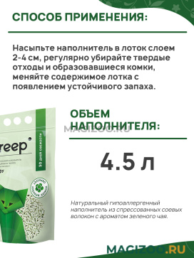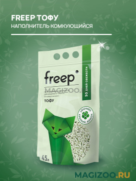 Уникальный наполнитель Freep, растительного происхождения, из спрессованных соевых волокон, благодаря своей пористой структуре отлично впитывают влагу, образовывая крепкий комок, который запирает неприятный запах внутри - это натуральный и экологически чистый материал, который не подвергается дополнительной обработке химическими составами, что гарантирует его гипоаллергенность.