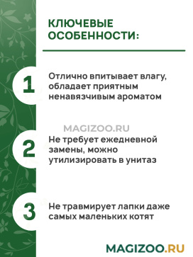 Отличительной особенностью наполнителя является то, что он обеспечит гигиеничность лотка, защищая вашего питомца и дом от бактерий, а так же его можно смывать в туалет, что нетипично для комкующихся наполнителей.