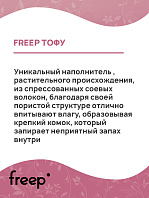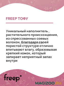 Уникальный наполнитель Freep, растительного происхождения, из спрессованных соевых волокон, благодаря своей пористой структуре отлично впитывают влагу, образовывая крепкий комок, который запирает неприятный запах внутри - это натуральный и экологически чистый материал, который не подвергается дополнительной обработке химическими составами, что гарантирует его гипоаллергенность.