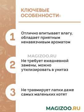 Отличительной особенностью наполнителя является то, что он обеспечит гигиеничность лотка, защищая вашего питомца и дом от бактерий, а так же его можно смывать в туалет, что нетипично для комкующихся наполнителей.