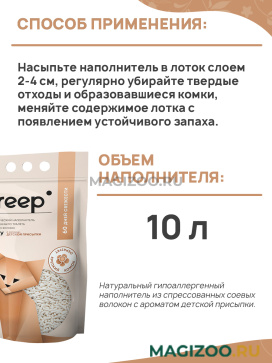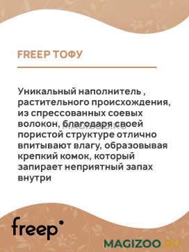 Уникальный наполнитель Freep, растительного происхождения, из спрессованных соевых волокон, благодаря своей пористой структуре отлично впитывают влагу, образовывая крепкий комок, который запирает неприятный запах внутри - это натуральный и экологически чистый материал, который не подвергается дополнительной обработке химическими составами, что гарантирует его гипоаллергенность.