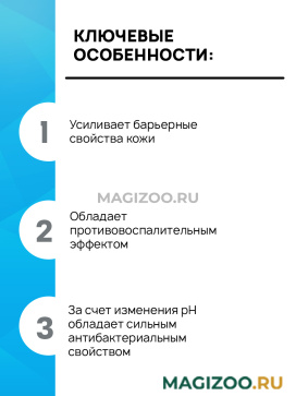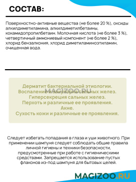 Шампунь с молочной кислотой для кошек и собак уменьшает толщину рогового слоя эпидермиса, делает кожу гладкой и ровной из-за отшелушевающего эффекта.