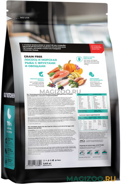 Полнорационный беззерновой сухой корм для котят и кошек всех возрастов с лососем и морской рыбой, фруктами и овощами.