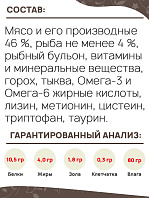 Пищевые добавки (на кг): ретинола ацетат 25000 МЕ, токоферола ацетат 300 мг, холекальциферол 1700 МЕ, холин хлорид 3400 мг, L-аскорбат-2-фосфат 70 мг, пантотенат кальция 20 мг, ниацин 80 мг, таурин 1800 мг, сульфат железа моногидрат 50 мг, аминокислотный хелат железа гидрат 20 мг, йодат кальция безводный 3 мг, сульфат меди пентагидрат 11 мг, сульфат марганца моногидрат 14 мг, аминокислотный хелат марганца гидрат 4 мг, сульфат цинка моногидрат 115 мг, аминокислотный хелат цинка гидрат 35 мг, селенит натрия 0,2 мг.