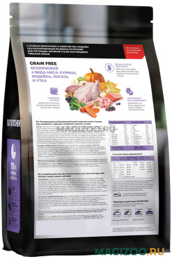 Полнорационный беззерновой сухой корм для котят и кошек всех возрастов с курицей, индейкой, лососем и уткой.