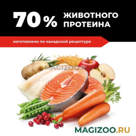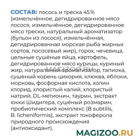 Лосось и треска 45 % (измельчённое, дегидрированное мясо лосося, измельчённое, дегидрированное мясо трески, натуральный ароматизатор (бульон из лосося), измельчнная, дегидрированная морская рыба жирных сортов, лососевый жир), горох, чечевица, цельные сушеные яйца, картофель, дегидрированное мясо курицы, куриный жир, натуральный ароматизатор, тапиока, сушеный корень цикория, клюква, яблоки, морковь, фосфорная кислота, холин хлорид, хлористый калий, хлористый натрий, DL-метионин, таурин, экстракт юкки Шидигера, сушеный розмарин, пробиотический комплекс (B.subtilis, B.licheniformis), экстракт токоферола природного происхождения (антиоксидант).