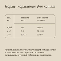 Пищевые добавки (на кг): ретинола ацетат 22000 МЕ, холекальциферол 1500 МЕ, токоферола ацетат 300 мг, холин хлорид 2000 мг, L-аскорбат-2-фосфат 70 мг, пантотенат кальция 20 мг, ниацин 25 мг, таурин 1000 мг, сульфат железа моногидрат 50 мг, аминокислотный хелат железа гидрат 22 мг, йодат кальция безводный 3,5 мг, сульфат меди пентагидрат 11 мг, сульфат марганца моногидрат 14 мг, аминокислотный хелат марганца гидрат 4 мг, сульфат цинка моногидрат 130 мг, аминокислотный хелат цинка гидрат 27 мг, селенит натрия 0,2 мг.
