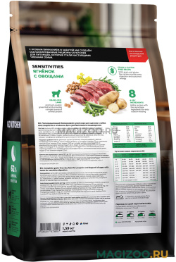 Полнорационный беззерновой сухой корм для щенков и собак всех возрастов с ягнёнком и овощами для чувствительного пищеварения.