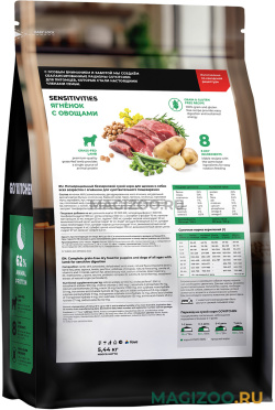 Полнорационный беззерновой сухой корм для щенков и собак всех возрастов с ягнёнком и овощами для чувствительного пищеварения.