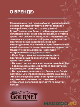 Информация о составе и ингредиентах, цветовом решении, технических и иных характеристиках, стране-изготовителе, внешнем виде и комплекте поставки товара носит справочный характер и основана на последних доступных к моменту публикации сведениях. Доставка данного товара осуществляется во все регионы РФ.Гурмэ® создал для Вашего любимца изысканную коллекцию мини-филе с превосходным вкусом в ароматном соусе или желе, приготовленные по технологии «гриль» из отборных ингредиентов, приготовленных с заботой именно для котов-гурманов. Вся линейка Гурмэ® изготовлена из отборных высококачественных ингредиентов. Подарите своему любимцу настоящее гастрономическое удовольствие!