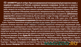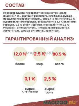 Состав: мясо и продукты переработки мяса (в том числе индейки 4 %), экстракт растительного белка, рыба и продукты переработки рыбы, овощи (в том числе 0,9 % сухого зеленого горошка, эквивалентно 8,1 % зеленого горошка, 0,5 % сухой моркови, эквивалентно 4,5 % моркови), аминокислоты, минеральные вещества, загуститель, сахара, витамины, красители.