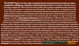 У Гурмэ все корма с хорошей большой добротной порцией - 85 грамм. Кошка бывает и не осиляет съесть такую большую мясную порцию, поэтому вторым заходом слизывант все дочиста. К меня претензий никаких нет.