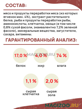 Мясные консервы с ягненком и зеленой фасолью подходят взрослым животным, они не вызывают аллергии и других неприятных реакций. 1 баночка идет на один прием пищи, на этикетке есть указания как кормить, на самом деле ничего сложного, 3 баночки в сутки и достаточно. Моя кошечка кушает корм хорошо и не болеет.