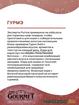 Корм для взрослых питомцев «Голд Нежные биточки» — это изысканная комбинация мясного вкуса в сочетании с полезными овощами. Корм для кошек от Gourmet полнорационный, содержит все необходимые для здоровья микронутриенты. Влажный корм с богатой вкусовой палитрой не оставит равнодушным Вашего взыскательного гурмана.