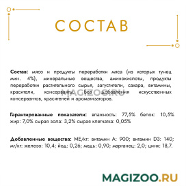• Влажные корма Gourmet не содержат искусственных ароматизаторов и консервантов. Состав товара: мясо и продукты переработки мяса, рыба и продукты переработки рыбы (из которых тунец мин. 4%), минеральные вещества, аминокислоты, продукты переработки растительного сырья, загустители, сахара, витамины, красители, консерванты. Без добавления искусственных консервантов, красителей и ароматизаторов. Гарантированный анализ: влажность: 77,5%; белок: 10,5%; жир: 7,0%; сырая зола: 3,2%; сырая клетчатка: 0,05%. МЕ/кг: витамин A: 900; витамин D3: 140; мг/кг: железо: 10,4; йод: 0,26; медь: 0,90; марганец: 2,0; цинк: 18,7. Для взрослой кошки среднего веса (4 кг) требуется 3 баночки в день. Кормление желательно разделить минимум на два приема. Данная суточная норма рассчитана для умеренно активных взрослых кошек, живущих в условиях нормальной температуры окружающей среды. В зависимости от индивидуальных потребностей кошки норма кормления может быть скорректирована для поддержания нормального веса Вашей кошки. Подавайте корм комнатной температуры. Следите, чтобы у Вашей кошки всегда была чистая, свежая питьевая вода. Информация о составе и ингредиентах, цветовом решении, технических и иных характеристиках, стране-изготовителе, внешнем виде и комплекте поставки товара носит справочный характер и основана на последних доступных к моменту публикации сведениях. Доставка данного товара осуществляется во все регионы РФ.