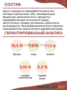 Блюдо однозначно изысканно, так как со вкусом кролика - кот к нему неравнодушен, ест всю порцию. Даю обычно на ужин, ну чтоб что-то более легкое на ночь и натуральное. Респект за отличный состав и класс премиум по приемлемому ценнику. Нет минусов тут , на мой взгляд.