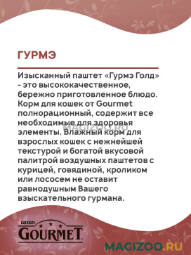 Изысканный паштет «Гурмэ Голд» - это высококачественное, бережно приготовленное блюдо. Корм для кошек от Gourmet полнорационный, содержит все необходимые для здоровья элементы. Влажный корм для взрослых кошек с нежнейшей текстурой и богатой вкусовой палитрой воздушных паштетов с курицей, говядиной, кроликом или лососем не оставит равнодушным Вашего взыскательного гурмана.