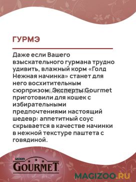 Даже если Вашего взыскательного гурмана трудно удивить, влажный корм «Голд Нежная начинка» станет для него восхитительным сюрпризом. Эксперты Gourmet приготовили для кошек с избирательными предпочтениями настоящий шедевр: аппетитный соус скрывается в качестве начинки в нежной текстуре паштета с говядиной.