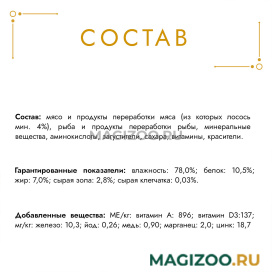 • Влажные корма Gourmet не содержат искусственных ароматизаторов и консервантов. Состав товара: мясо и продукты переработки мяса, рыба и продукты переработки рыбы (из которых лосось мин. 4%), минеральные вещества, аминокислоты, загустители, сахара, витамины, красители. МЕ/кг: витамин A: 896; витамин D3:137; мг/кг: железо: 10,3; йод: 0,26; медь: 0,90; марганец: 2,0; цинк: 18,7 Гарантированный анализ: влажность: 78,0%; белок: 10,5%; жир: 7,0%; сырая зола: 2,8%; сырая клетчатка: 0,03%. Суточная норма: 3 баночки в день для взрослой кошки (средний вес 4 кг), минимум в два приема. Данная суточная норма рассчитана для умеренно активных взрослых кошек, живущих в условиях нормальной температуры окружающей среды. В зависимости от индивидуальных потребностей кошки норма кормления может быть скорректирована для поддержания нормального веса вашей кошки. Подавайте корм комнатной температуры. Следите, чтобы у Вашей кошки всегда была чистая, свежая питьевая вода. Информация о составе и ингредиентах, цветовом решении, технических и иных характеристиках, стране-изготовителе, внешнем виде и комплекте поставки товара носит справочный характер и основана на последних доступных к моменту публикации сведениях. Доставка данного товара осуществляется во все регионы РФ.
