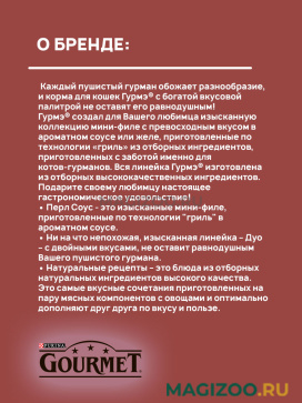 Гурмэ® создал для Вашего любимца изысканную коллекцию мини-филе с превосходным вкусом в ароматном соусе или желе, приготовленные по технологии «гриль» из отборных ингредиентов, приготовленных с заботой именно для котов-гурманов. Вся линейка Гурмэ® изготовлена из отборных высококачественных ингредиентов. Подарите своему любимцу настоящее гастрономическое удовольствие!