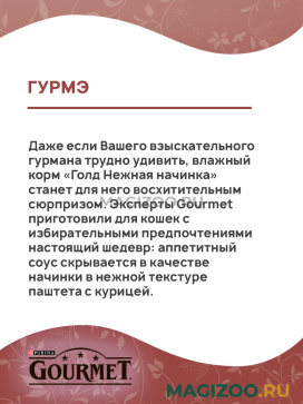 Даже если Вашего взыскательного гурмана трудно удивить, влажный корм «Голд Нежная начинка» станет для него восхитительным сюрпризом. Эксперты Gourmet приготовили для кошек с избирательными предпочтениями настоящий шедевр: аппетитный соус скрывается в качестве начинки в нежной текстуре паштета с курицей.