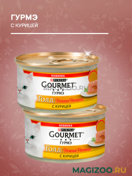 Влажный корм (консервы) GOURMET GOLD НЕЖНАЯ НАЧИНКА для взрослых кошек с курицей - хороший, привлекательный для животных, корм. По всем параметрам не уступает аналогам. Сытный, с хорошим составом и витаминами в содержании. Коты все съедают, прям из баночки. Не голодают. Нет рвоты и других неприятных симптомов.