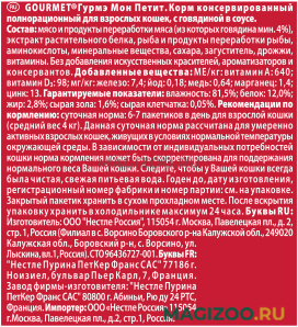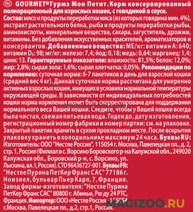 Влажный корм (консервы) GOURMET MON PETIT для взрослых кошек с говядиной в соусе не имеет недостатков. Полноценный состав, нормальная влажность и большое количество белка. Порция выходи на один раз, пачки хватает, чтобы наесться. У кота хорошее настроение и высокая активность после приема пищи.