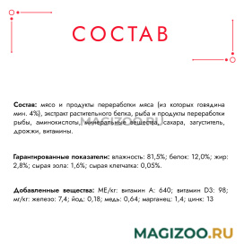 Не содержит искусственных красителей, ароматизаторов и консервантов. Гарантированные показатели: влажность: 81,5%; белок: 12,0%; жир: 2,8%; сырая зола: 1,6%; сырая клетчатка: 0,05%. МЕ/кг: витамин A: 640; витамин D3:98; мг/кг: железо: 7,4; йод: 0,18; медь: 0,64; марганец: 1,4; цинк: 13 Суточная норма: 6-7 пакетиков в день для взрослой кошки (средний вес 4 кг), в два приема.