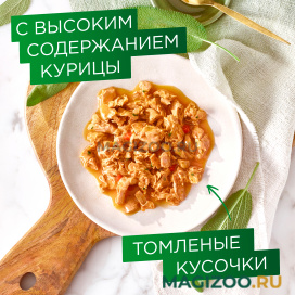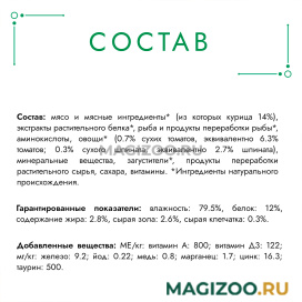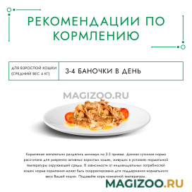 *Ингредиенты натурального происхождения. Гарантированный анализ: влажность: 79.5%; белок: 12.5%; содержание жира: 2.8%; сырая зола: 2.6%; сырая клетчатка: 0.05%. МЕ/кг: витамин А: 880; витамин Д3: 134; мг/кг: железо: 10; йод: 0.25; медь: 0.8; марганец: 1.9; цинк: 18.2; таурин: 550. Для взрослой кошки среднего веса (4 кг) требуется от 3 до 4 баночек в день. Кормление желательно разделить минимум на 2-3 приема.