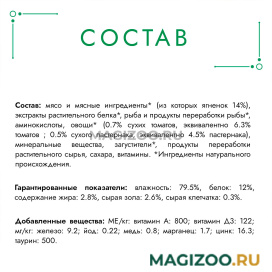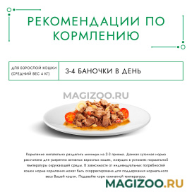 *Ингредиенты натурального происхождения. Гарантированный анализ: влажность: 79.5%; белок: 12.5%; содержание жира: 2.8%; сырая зола: 2.6%; сырая клетчатка: 0.05%. МЕ/кг: витамин А: 880; витамин Д3: 134; мг/кг: железо: 10; йод: 0.25; медь: 0.8; марганец: 1.9; цинк: 18.2; таурин: 550. Для взрослой кошки среднего веса (4 кг) требуется от 3 до 4 баночек в день. Кормление желательно разделить минимум на 2-3 приема.