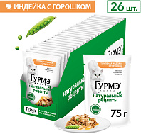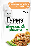 Влажный корм (консервы) ГУРМЭ НАТУРАЛЬНЫЕ РЕЦЕПТЫ для взрослых кошек с индейкой и горошком - хороший корм, по доступной цене. Всегда тут беру, не найти в оффлайне. Цена хорошая за пакетик. Порция корма котам придает сытость, они не голодают. Получают все необходимые элементы. В результате довольные и бодрые. Нет проблем со здоровьем.