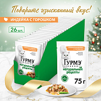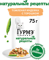 Влажный корм ГУРМЭ НАТУРАЛЬНЫЕ РЕЦЕПТЫ для взрослых кошек с индейкой и горошком покупала для своего усатого друга я не один раз, и ни разу корм не подвел. Свежий, с хорошими сроками годности. Выглядит симпатично и натурально, есть овощи действительно, производитель не обманывает.