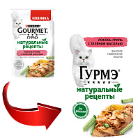 Паучи Пурина Гурмэ Натуральные рецепты для взрослых кошек с индейкой - питание высокого качества. Стоят подороже других кормов, но цена оправдана. У корма получше состав, много натуральных ингредиентов, на первых местах полезные компоненты. Выглядит питание аппетитно. Кусочки мяса кот жует и глотает без проблем, наедается и не просит больше.